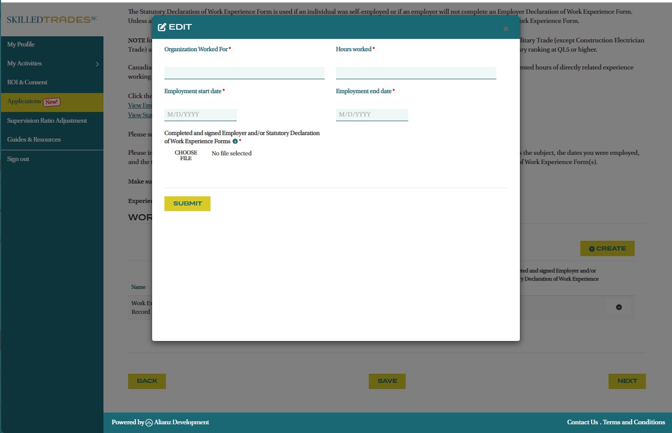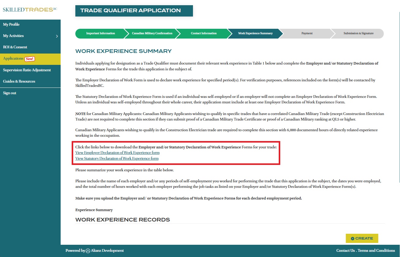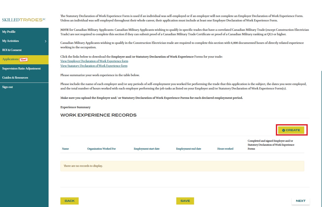 Note: Military Applicants wishing to qualify in the Construction Electrician trade are required to summarize their work history and submit Employers and/or Statutory Declaration form(s). Other Military Applicants who want to challenge specific trades that have a correlated Canadian Military Trade are NOT required to complete this page if they have submitted the required documents earlier.