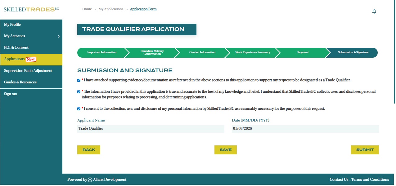 - Review and check the items on the Submission and Signature page to provide consent and confirm your Trade Qualifier application. Click the “Submit” button after checking all the boxes.