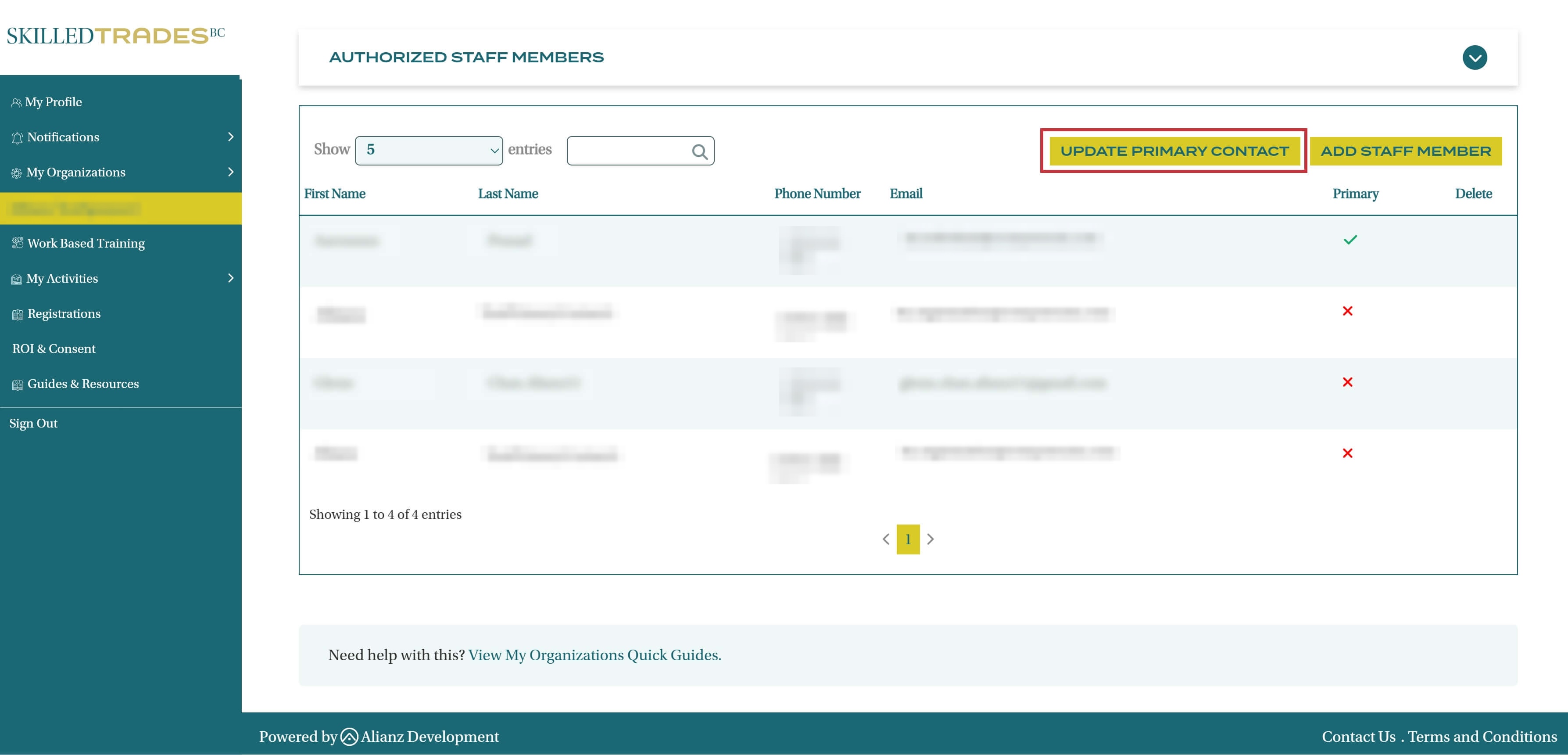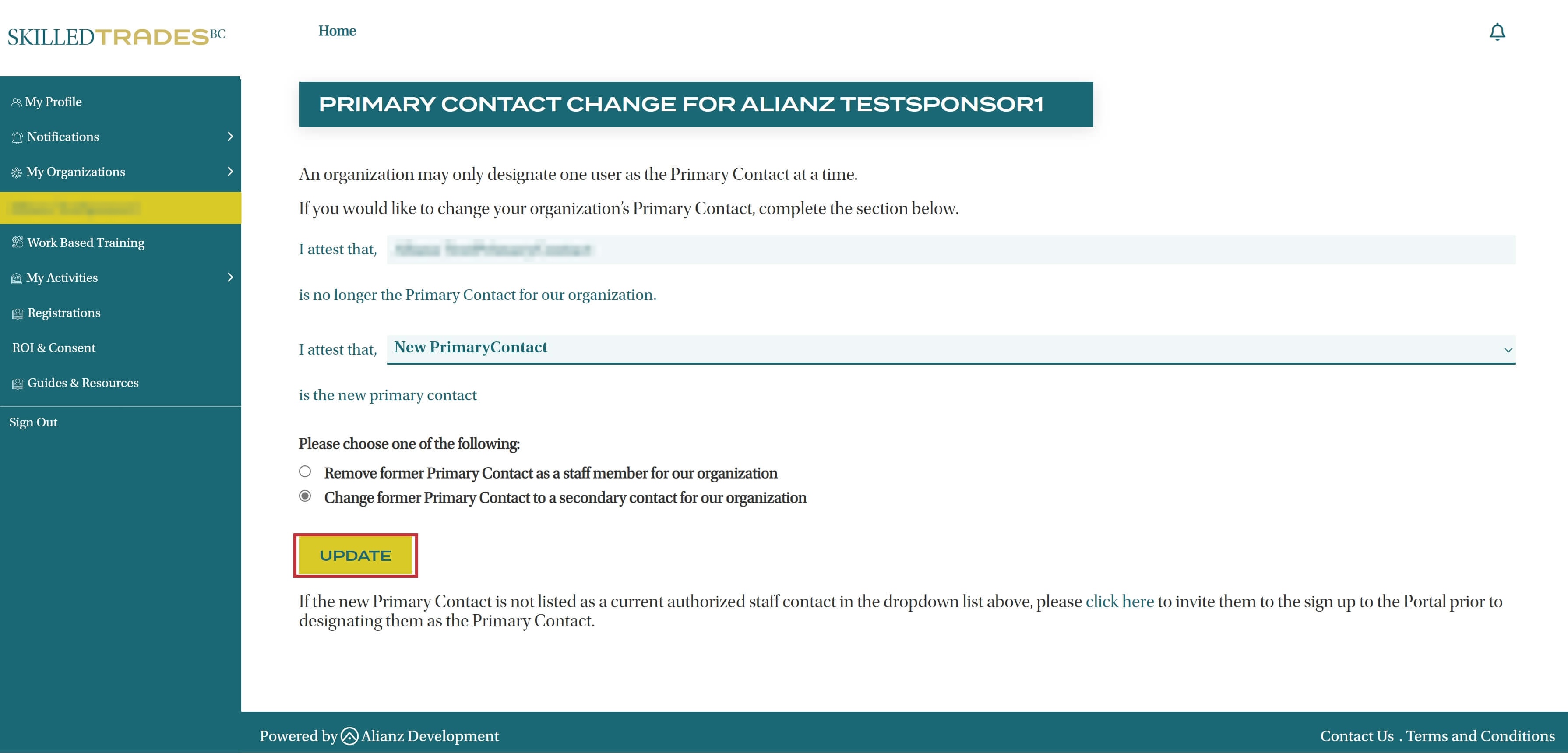 The new primary contact can be an authorized staff member on the list or another individual in the SkilledTradesBC system who is not active in any apprenticeship.