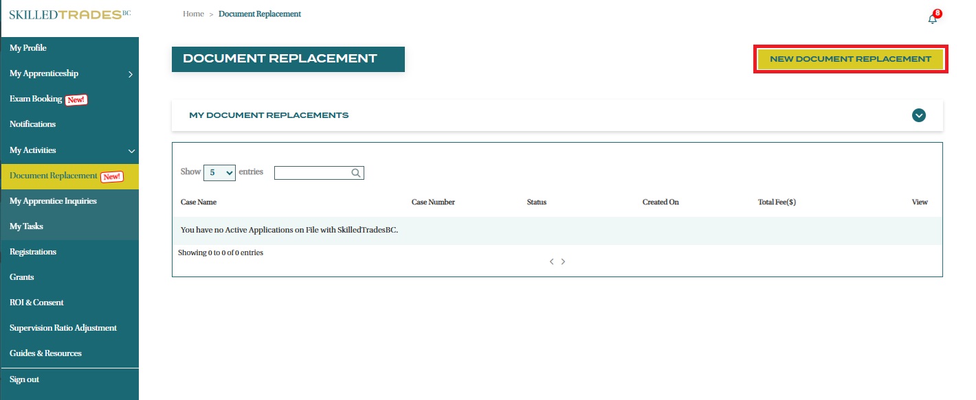 - Click on the “New Document Replacement” button.