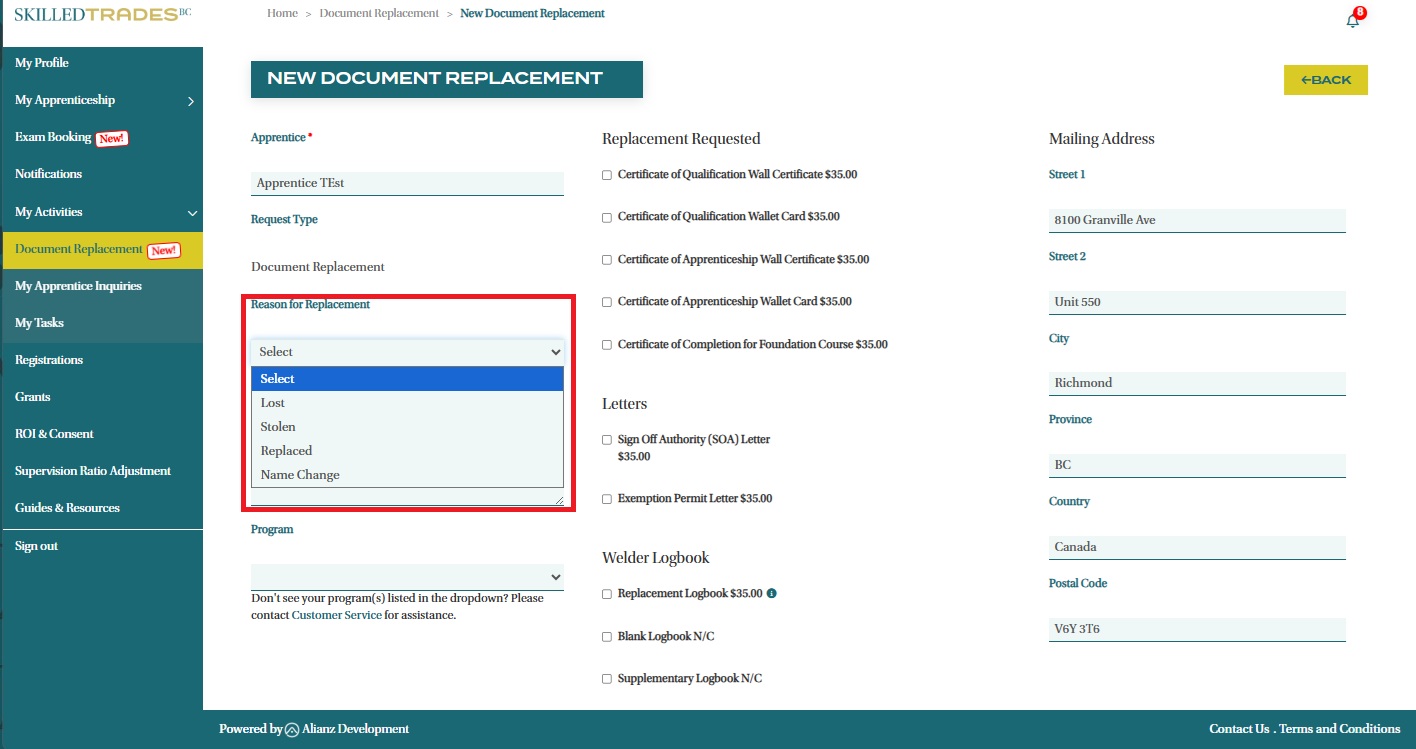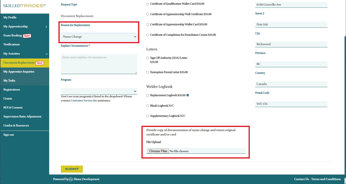 - If the reason for the document replacement is a Name Change, you will need to submit supporting documentation.