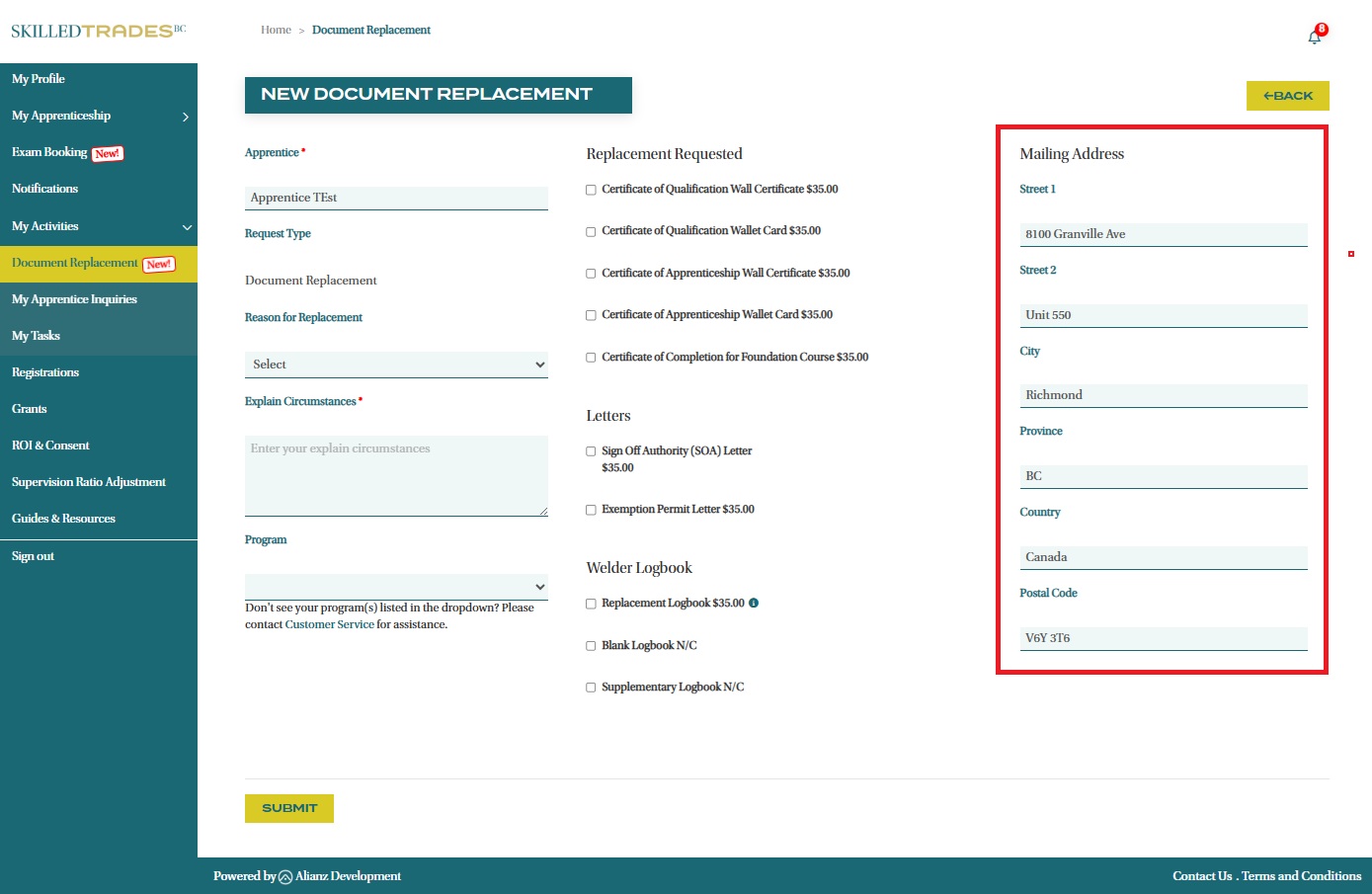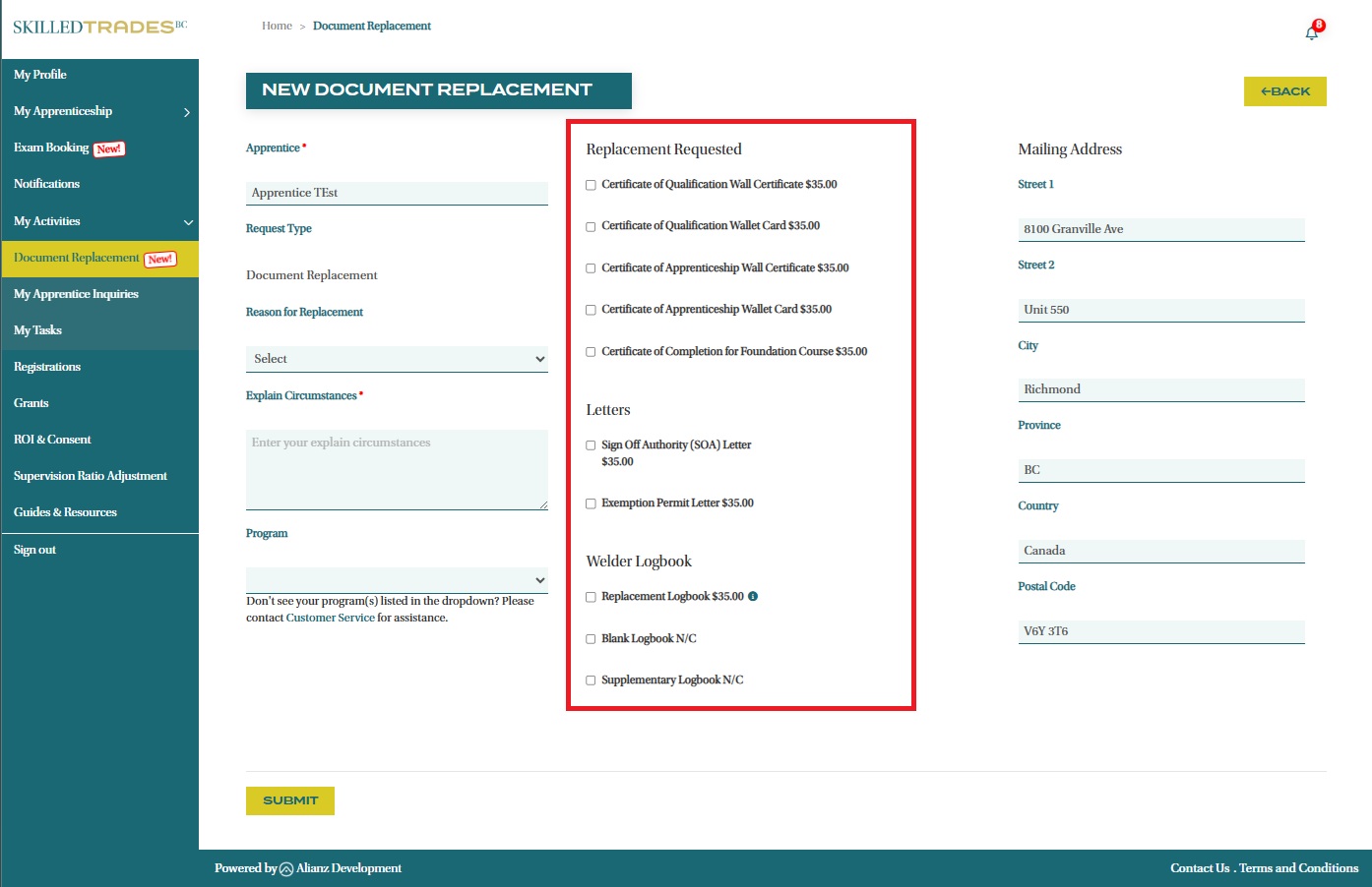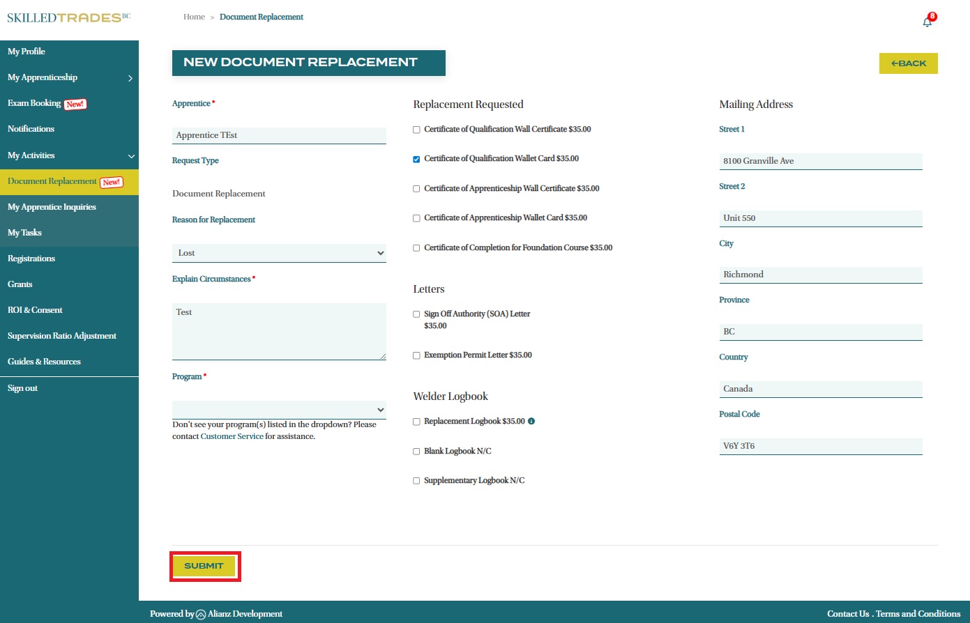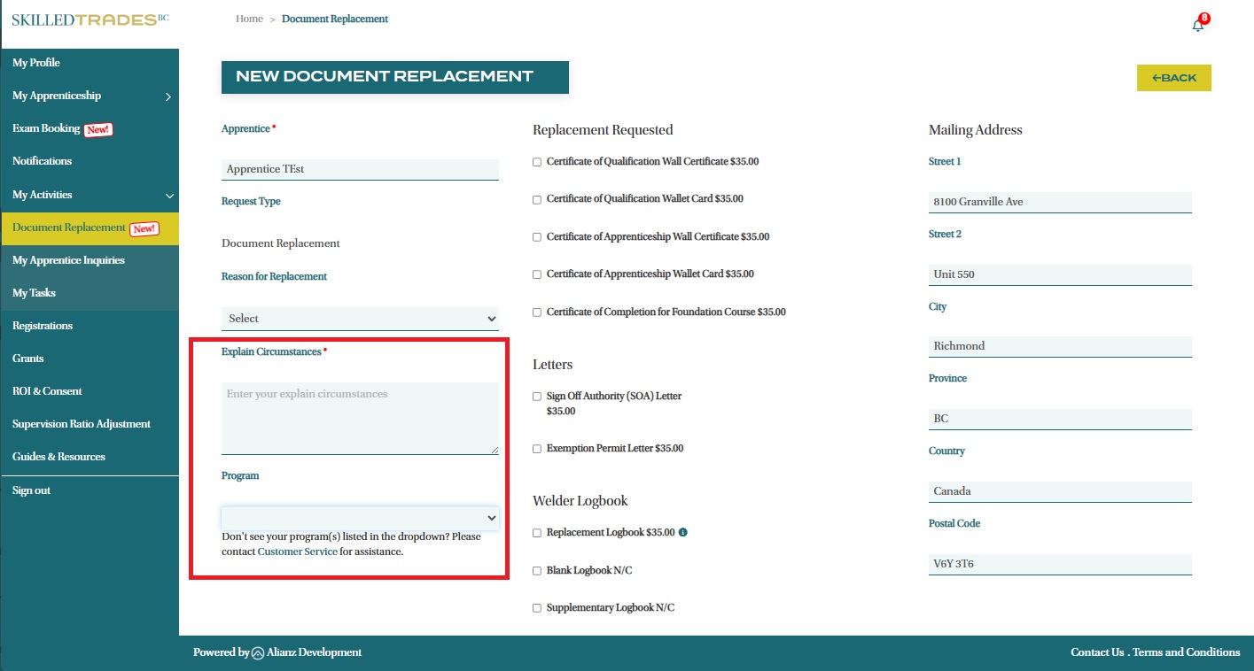 - Provide your mailing address for the delivery of the replacement document.