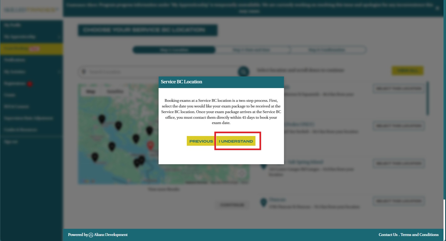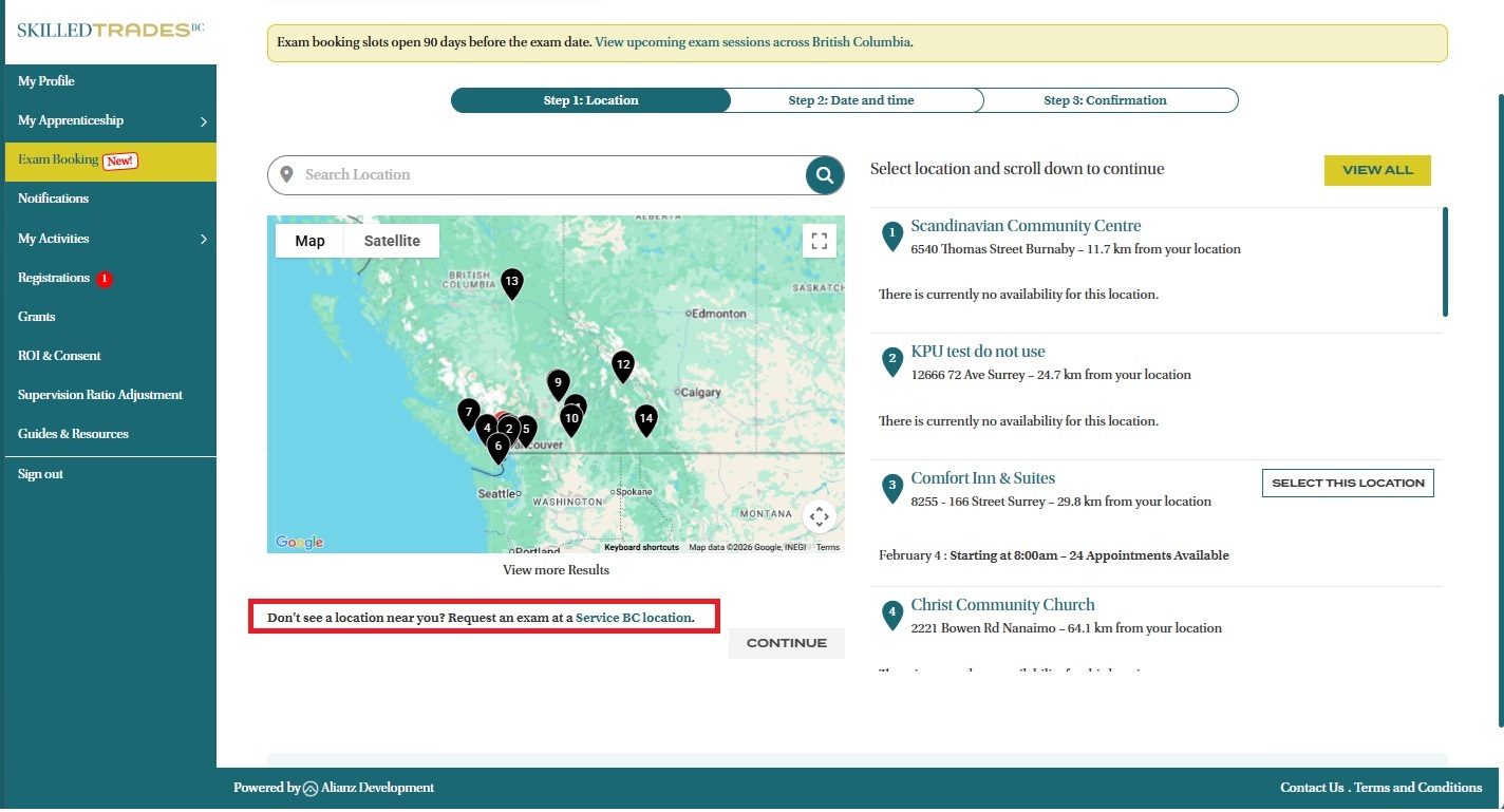 - After you have confirmed your exam eligibility and would like to select a Service BC location to write your exam, click on the “Service BC location” link located at the bottom of the page.