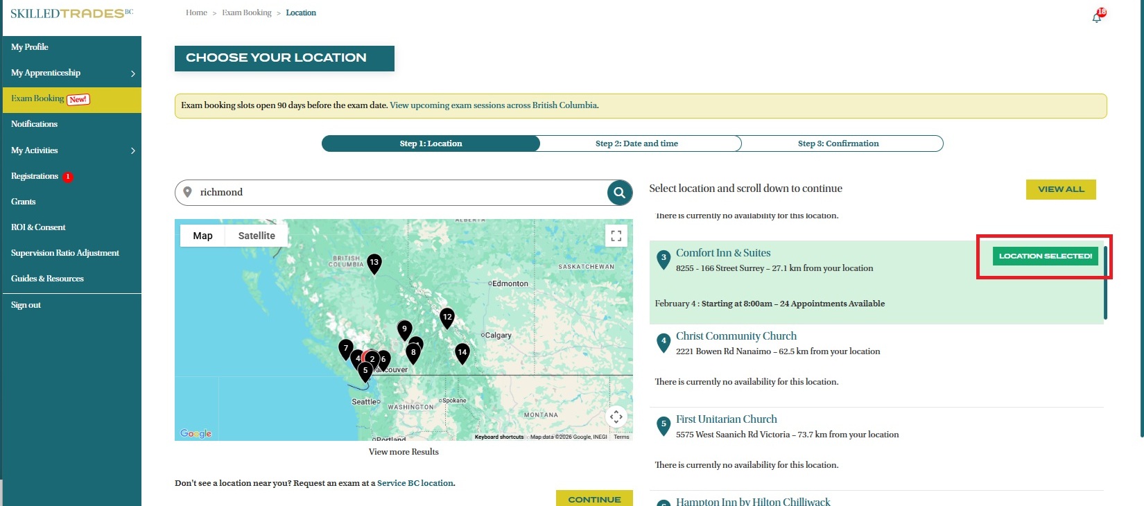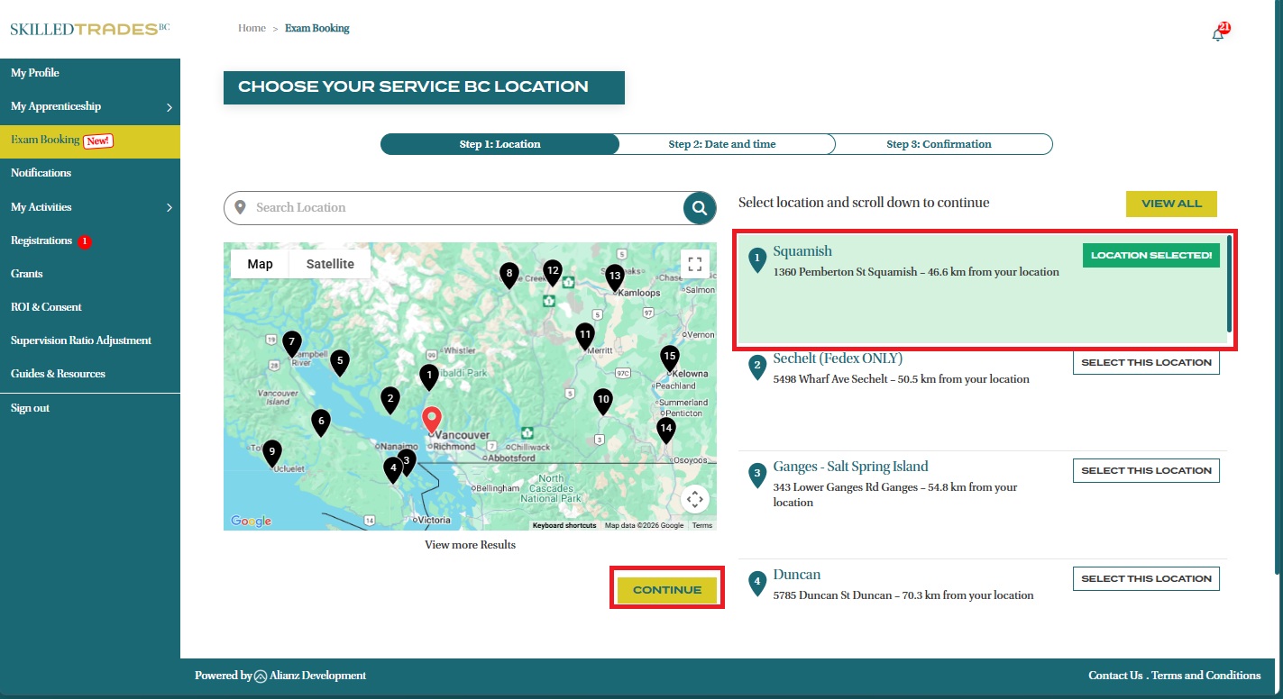 - A list of all nearby exam locations along with available appointments will appear on the right of the map. Click “Select This Location” to confirm your choice, then click the “Continue” button.