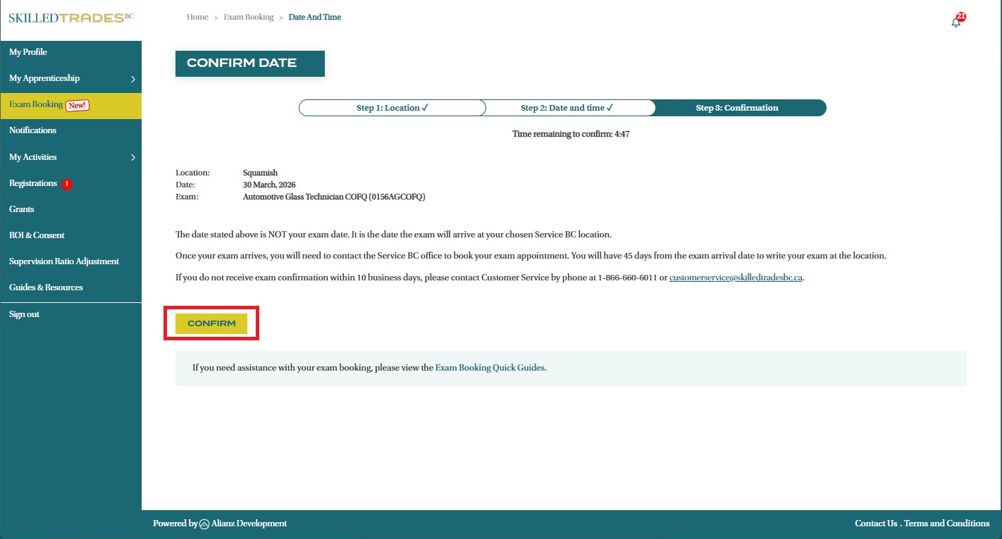 Important: You will receive an email confirmation. If you do not receive the email confirmation within 10 days of your Exam Booking request, please contact Customer Service for assistance.