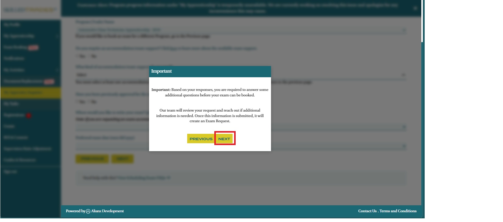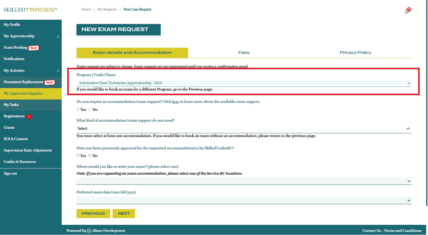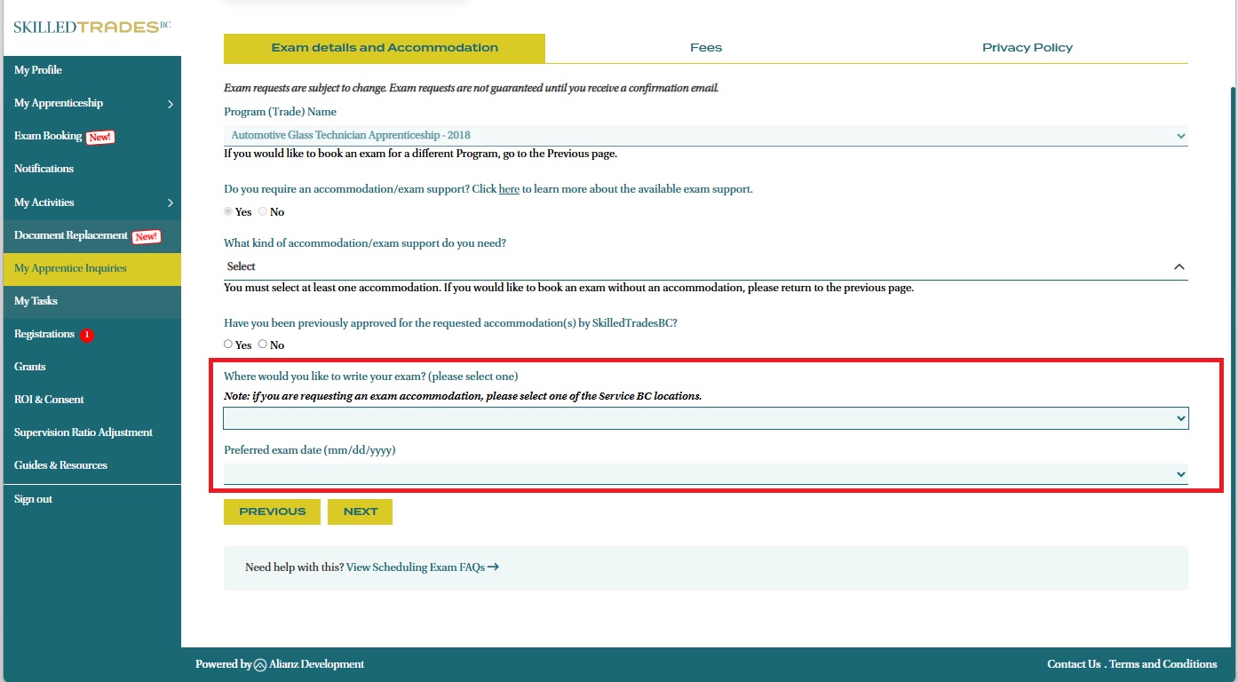 - Complete all the fields required. The Program Name is pre-populated. If you wish to change the Program Name, click “Previous” and select a different Program. The exam booking tool will re-assess your eligibility for your selected program.