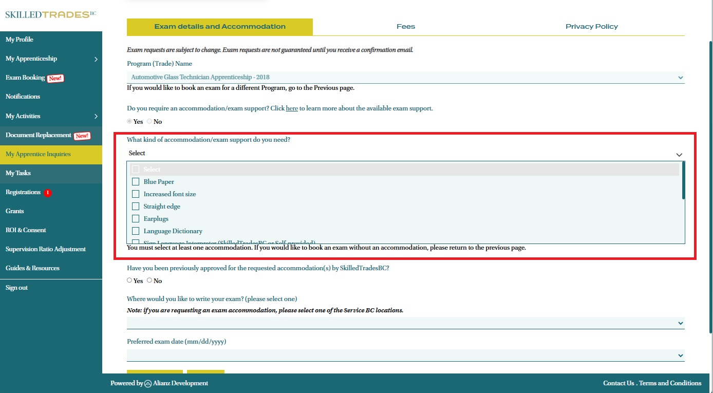 - Select the exam accommodation you need from the drop-down menu.