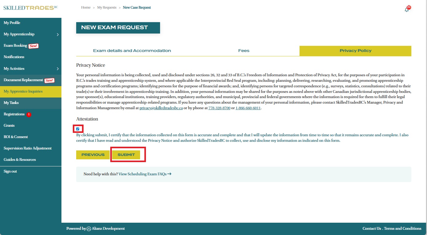 - Complete the attestation and submit your Exam Request.