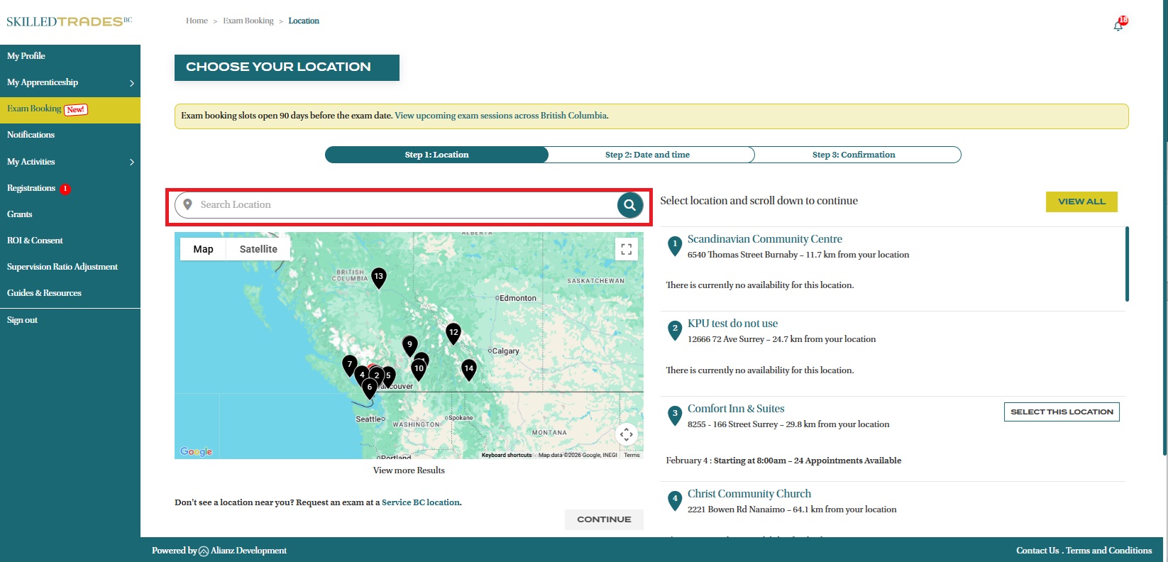 - Select the location where you would like to book your exam. Use the Search Location bar to find the nearest exam center based on your current location.