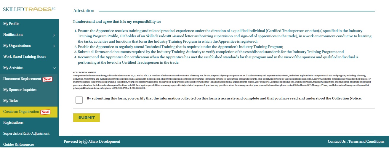 - Read the Attestation below and check the box to agree. Click the “Submit” button to complete the creation process.