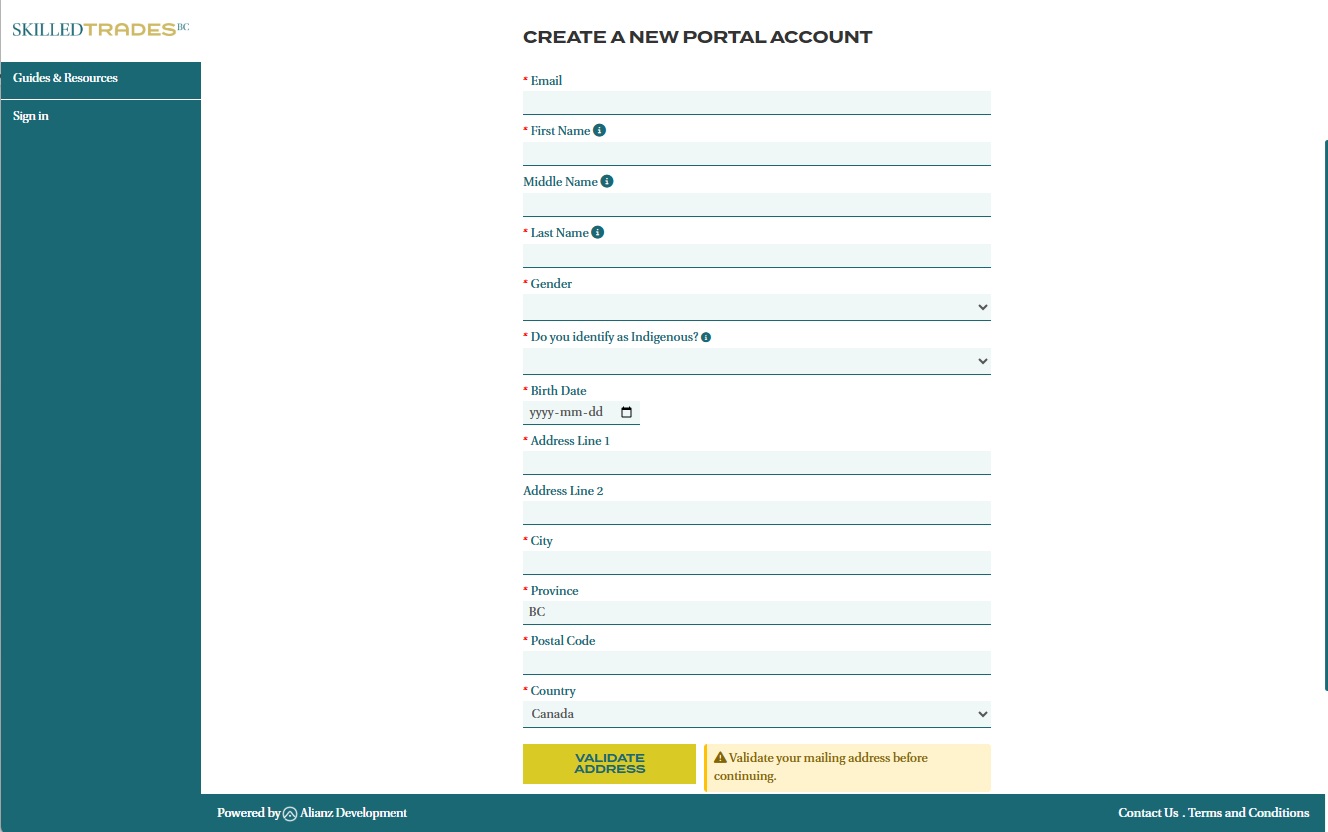 - Go to https://portal.skilledtradesbc.ca/Account/Login/Register to start creating your account.