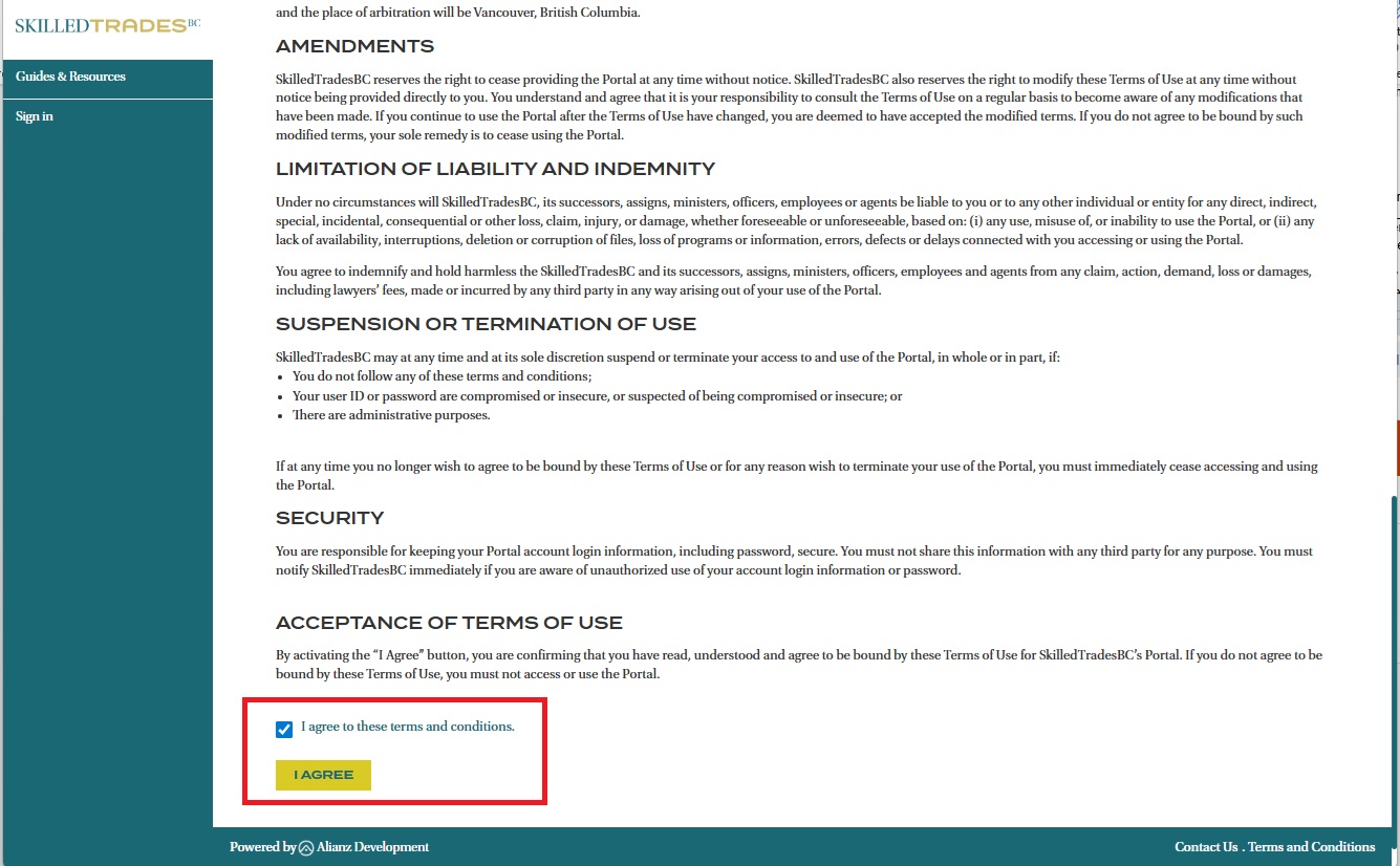 - Read through the terms and conditions for your application. Then, check “I agree to these terms and conditions” box and click on the “I agree” button to continue.