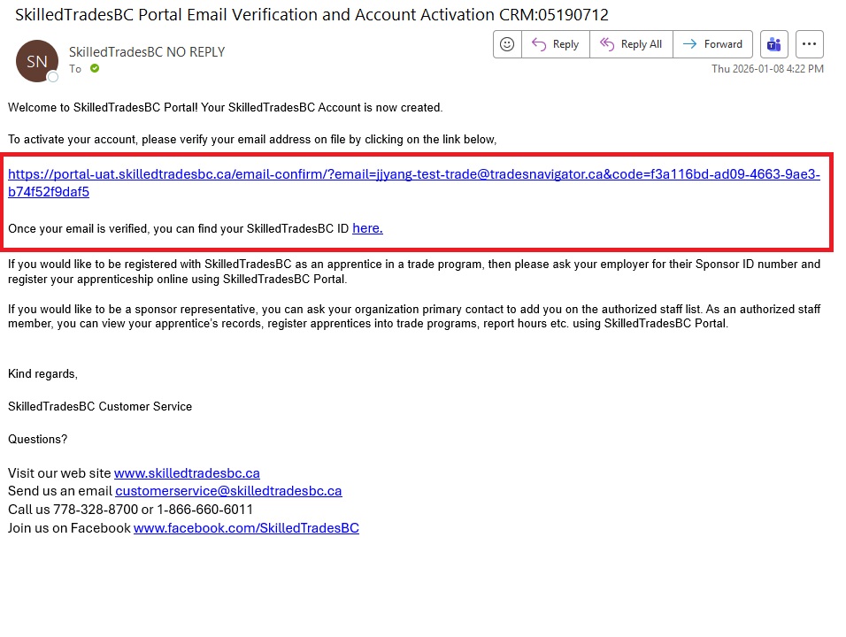 - Once your profile is created, you will receive a confirmation email from SkilledTradesBC containing an activation link. Click on this link to activate your account and return to Portal. Your account is now set up.
