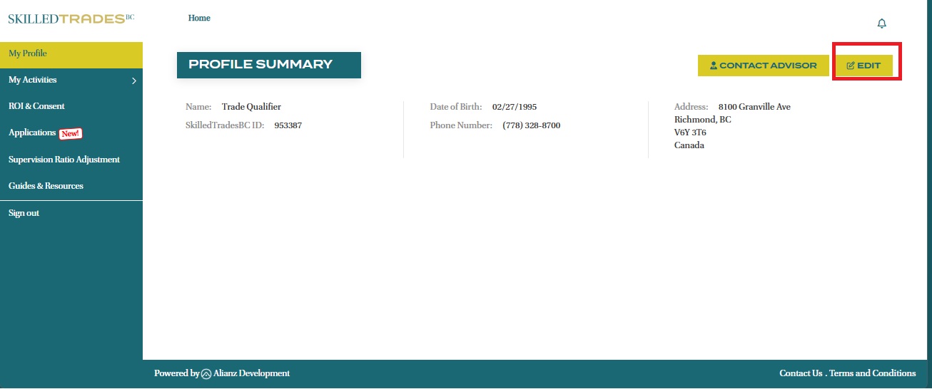 After logging in, you will be directed to a Profile Summary page displaying your personal information. To update your information or password, click the ‘Edit’ button located on the right side of the screen.