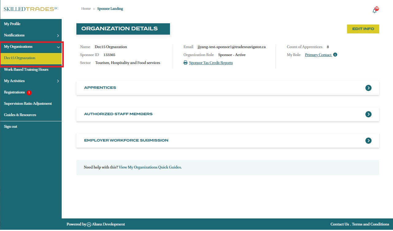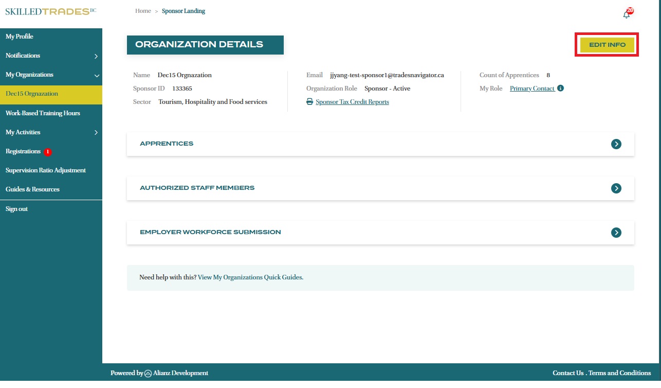 - A Primary Contact can view and edit select information about the organization by clicking on the “Edit Info” button.